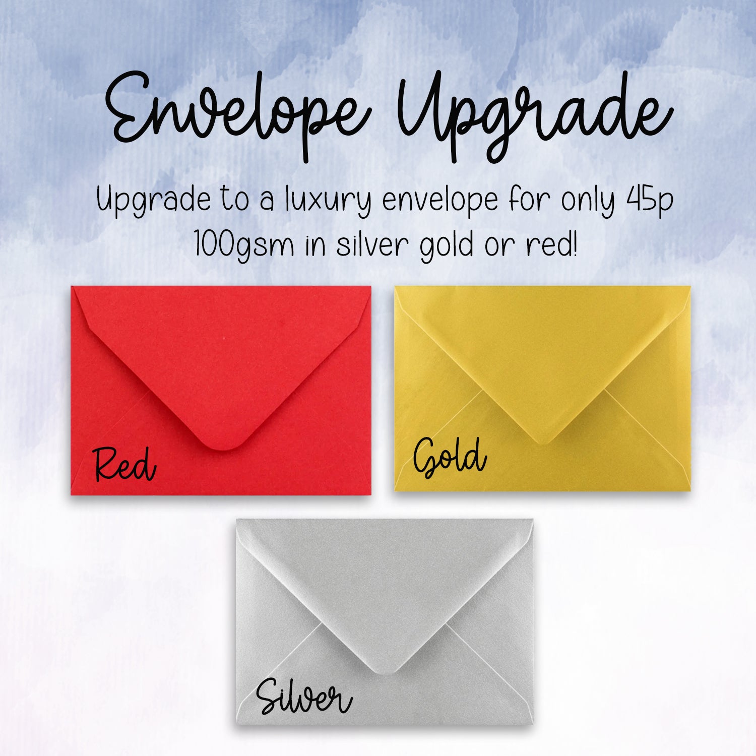 5" x 7" white 300gsm matt card with 100gsm white envelope.