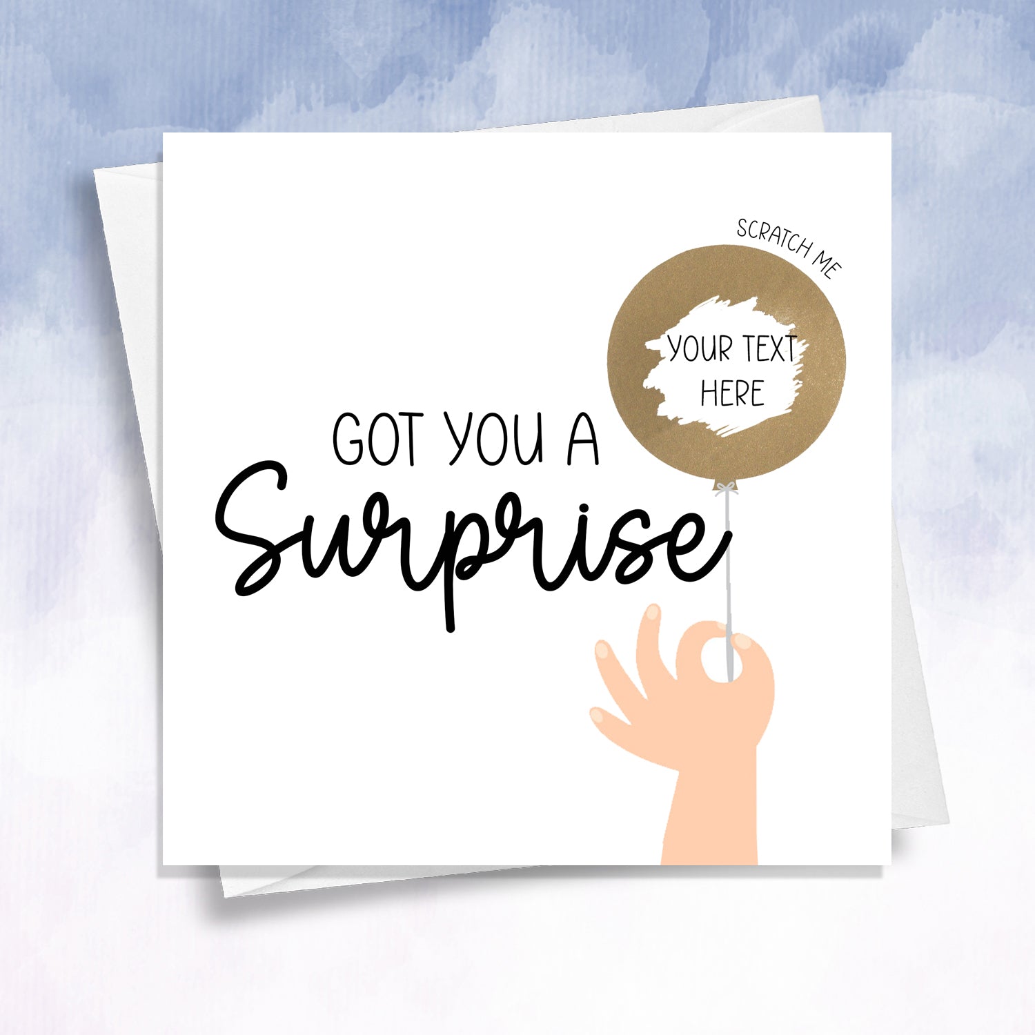 Introducing our amazing "Got You a Surprise" scratch off pregnancy reveal card! This versatile and heartwarming card features a scratch off balloon that will leave the recipient in absolute awe. Whether you're revealing a new baby on the way or announcing a new brother or sister, this card is the perfect way to share the exciting news with your loved ones. The surprise element of the scratch off adds extra fun and excitement to your special announcement. Crafted with love and care, this card is a unique and memorable way to share the joy of your growing family with those you hold dear. Say it with a scratch off and make your pregnancy reveal truly unforgettable!