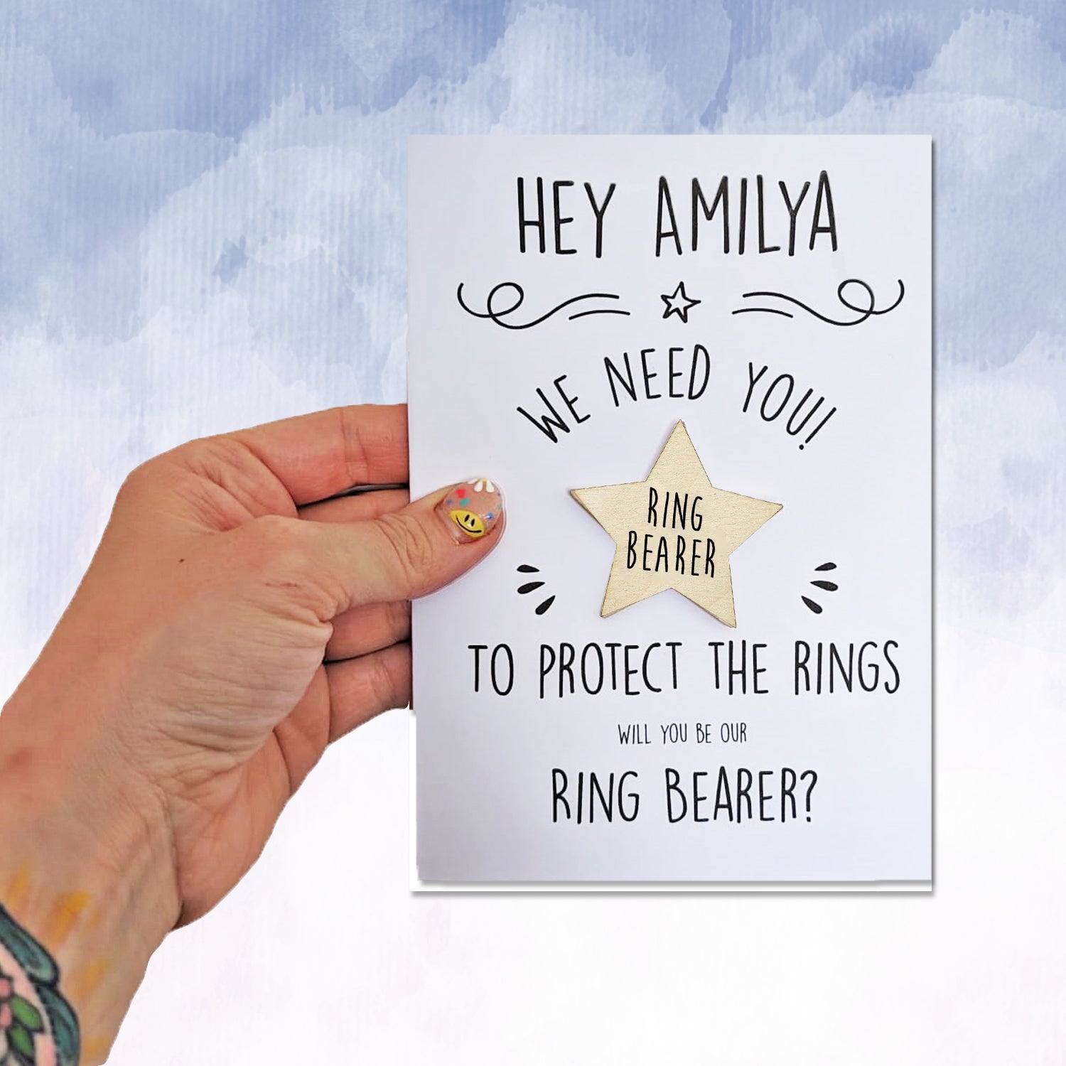Are you looking for a unique and heartwarming way to ask someone to be your ring bearer? Look no further than our personalised ring bearer badge wedding card! This adorable wooden ring security badge is attached to a customised card, making it the perfect keepsake for the special occasion. Simply add the recipient's name to the card and watch their face light up as they receive this thoughtful invitation. The card comes with a white envelope and is a beautiful way to adorn your chosen ring bearer on the big day. Make the moment even more memorable with our personalised ring bearer badge wedding card.